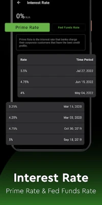 Within our app you can also find the latest Prime Rate or even the Fed Funds Rate released by Federal Reserve and Central Bank. Prime Rate is the interest rate that banks charge their corporate customers that have the best credit profile. Generally, prime rate is about 3 percent higher than the federal funds rate. Federal Funds Rate is the central interest rate in the U.S. financial market. Federal Funds Rate, set by the Federal Open Market Committee (FOMC), is the starting point at which the Prime Rate is determined.