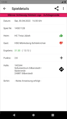 - Details zu einem Spiel (z.B. Datum, Uhrzeit, Halbzeitergebnis, Schiedsrichteransetzung, Hallenanschrift etc.)