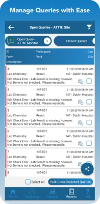Robust reporting options enhance the ways research teams view and analyze data gathered in clinical trials. In addition to My Queries, Action Items, Regulatory Audit, and Outcome Summary reports, TrialKit generates a dynamic, visual report to track study progress in real-time.